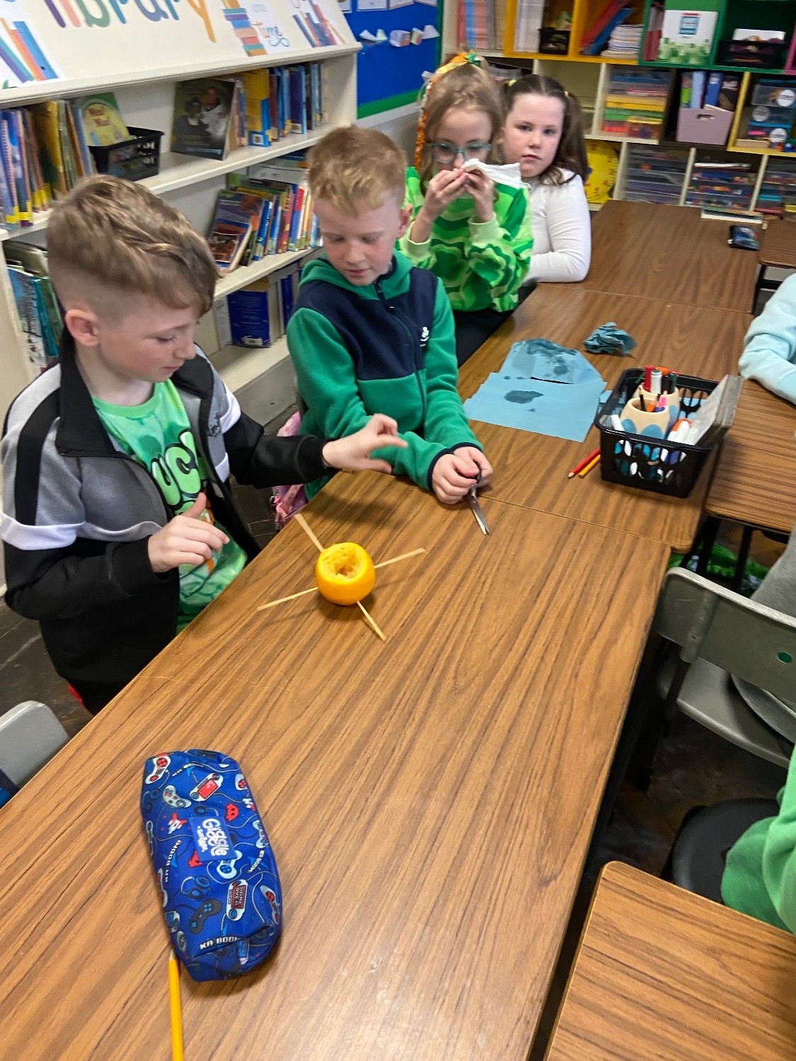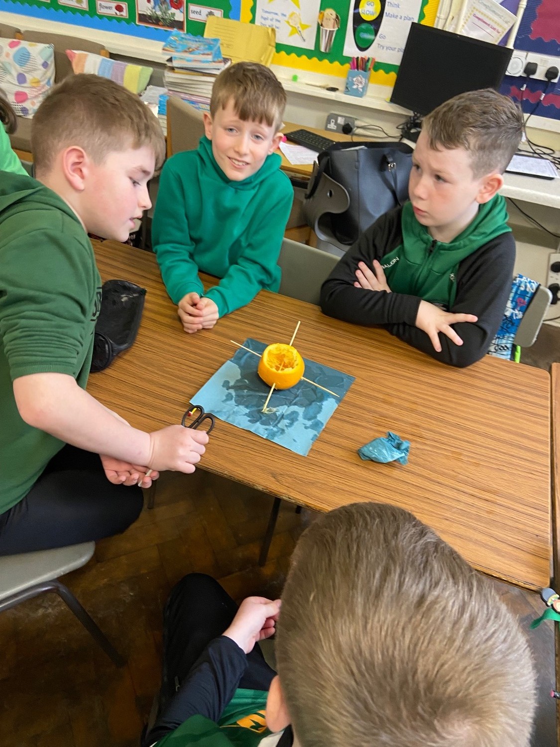 Today P4/5 had  great fun making their own bird feeders using oranges. It was a messy job but worth it because the feeders are eco friendly! We then hung them in the trees around the school in the hopes of catching some birds feeding from them.